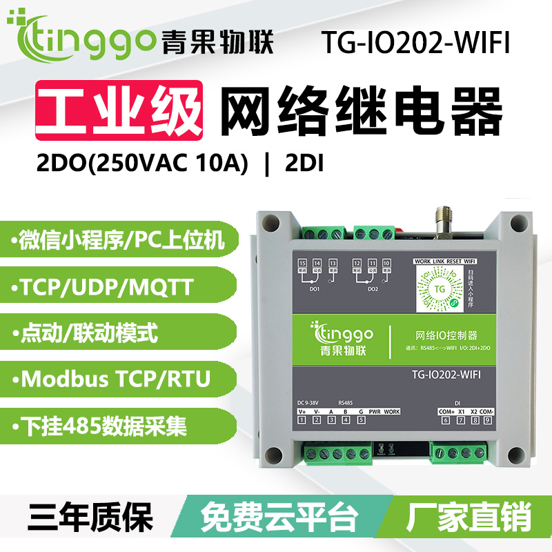 TG-IO202-WIFI产品是采用标准 Modbus- RTU 协议的网络继电器设备,支持RS485或网络通信。支持宽电压供电,多路输入输出控制,可广泛应用于工业生产、农业、智慧城市、写字楼等各类应用场景。本系列产品型号种类丰富,供用户选择。
